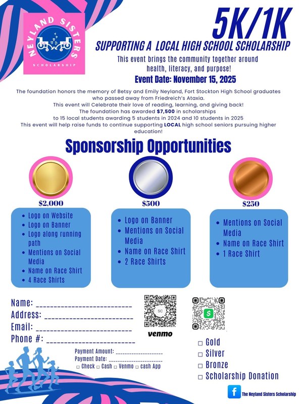 NEYLAND SISTERS 5K/1K Run & Walk EVENT https://www.fort-stockton.lib.tx.us/news-events/neyland-sisters-5k-1k-run-walk-1 https://www.fort-stockton.lib.tx.us/@@site-logo/FSPB-roadrunner-book-V2.eps.png NEYLAND SISTERS 5K/1K Run & Walk EVENT
